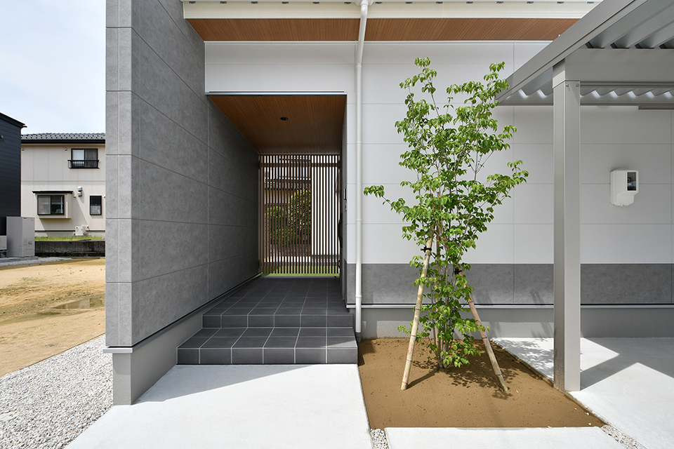 BELS最高評価★5の高断熱省エネ住宅。UA値0.52で一般住宅より約40%断熱性能アップ、省エネ等級6でエネルギー消費を21%削減。モダンな箱型に和の趣を取り入れた外観は、木目の軒天がアクセント。玄関は木のぬくもりと柔らかな間接照明がやすらぎを演出。奥行きあるLDKは大型窓から明るい陽射しが降り注ぎ、壁掛けTVとL字型ソファでくつろぎの空間に。ダイニングから中庭を見渡せ、お子様も安心して遊べます。白で統一した清潔感あるキッチンは腰壁で手元を隠し、いつもスッキリ。ダイニング奥の畳コーナーは遊び場やお昼寝に最適。ランドリーにはガス乾燥機横のカウンターがあり家事も快適。広々カーポート付きで暮らしやすさも充実した、省エネとデザイン性を兼ね備えた理想の住まいです。