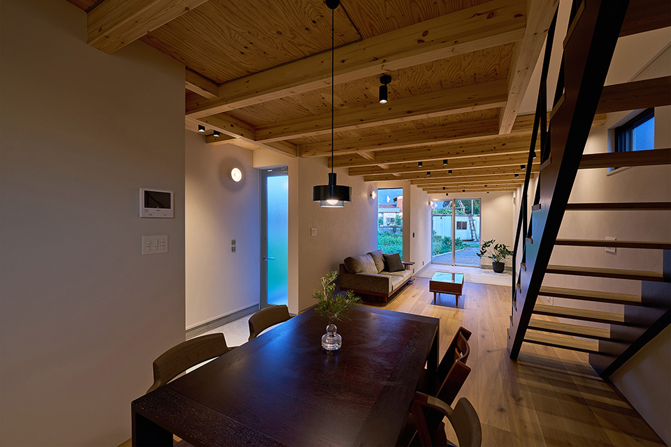河川沿いにある計画地は、旗状地かつ三角形という変形敷地であり、隣地は相続放棄された空地で眺望が大きく開けていた。人通りの多い土手道から一望できるこの敷地で、美容業界で仕事をされるクライアントご夫婦から、個性を主張する建物を求められた。 変形地に合わせた外形と、各階で必要な容積の検討から、積み木のような段々形状が導かれた。この段々形状を、連続した変化を繰り返す明解な形態生成規則として整理し、段々に合わせ規則的に窓を配列することにより、外観に特徴的なリズムと連続感が生みだした。今回は住宅サイズだが、同じ連続的変化を繰り返すことで、より規模の大きな建物まで応用可能な形態生成規則となっている。 敷地形状に追従したボリュームの分節は、外部から見た時の建物の圧迫感を和らげており、また、室内に連続的に表れる縦長窓が景色を断片的に切り取り、風景のかけらをインテリアの一部として取り込んでいる。