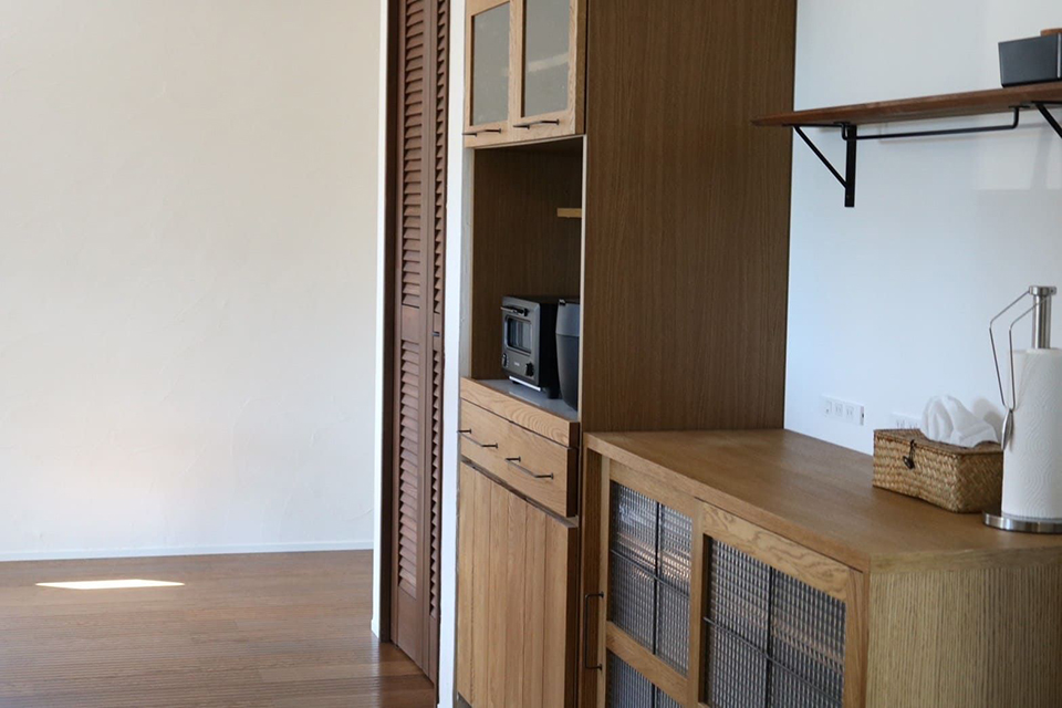 本物件の作品テーマは“ ナチュラルアメリカンハウス ”。お施主様の要望としては、カフェのような落ち着く空間でヴィンテージ感もありつつ木の温もりやインテリアを楽しめる広々としたデザインを、とのご希望で弊社ではファーストヒアリングの際、お施主様のライフスタイルや取り入れたい間取り・空間デザインを丁寧に聞き取りご要望に添えた設計を。予め購入予定の家具やインテリア雑貨に合わせて空間の色味や照明設計等も思案し、パッシブデザイン設計も取り入れた室内には柔らかな優しい日差しがより心地よい空間に。生活導線も考えられた間取りで、広いキッチンにはスイージーの無垢の木のキッチンとお施主様が選んだ食器棚が調和しよりカフェテイスト空間を際立たせ、毎日使う場所だからこそ気分が上がるような空間デザインに。LDKはWOODONE様の特徴的な床材を採用し感触や凹凸が楽しく、ダークブラウンの色合いが全体を素敵にまとめている。
