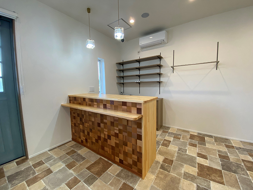 美容院の施工例です。 『可愛くて綺麗』を意味するフランス語の店名にあったイメージにするため、欧風のデザインを取り入れ、装飾やアクセントを加えてほしいとのことでした。 お施主様が最初に選んだ水色のドアからイメージを広げ、他店から引き継いだ照明や手洗いとの調和も取る必要がありました。 こちらでは、WOODONEさんの仕上げてる収納・ドレタス引戸・笠木や窓枠等を使用しています。部材を選ぶにあたり、サイズの指定ができたり、豊富なカラーバリエーションもあったので、華やかながらも調和の取れた理想の空間に仕上がったのではないかと思います。