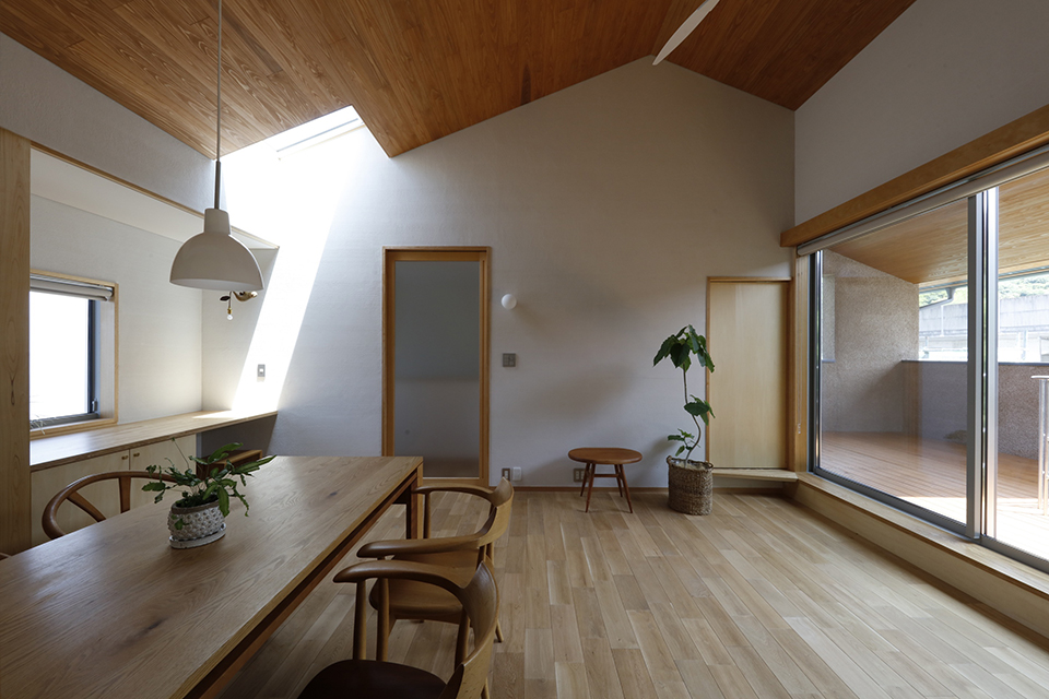 電車が走る大きな高架のそばに建つ、28.5坪の2階建て。ご夫婦二人で暮らす住まいです。 高架が視界を遮る位置にあるため、1階からは山の景色が望めません。そこで、日々の中で自然を感じられるよう、リビングを2階に配置しました。喧騒を忘れ、開放感のある空間を目指しています。 植物が大好きなお施主様。2階リビングにしたことで土面から離れてしまいますが、一部の屋根とバルコニーを抜いて植栽を配置することで、アプローチや室内からも緑が近くなり、手が届くような距離で提案しました。 音楽が趣味で楽器を演奏されるご夫婦のため、防音室も設けました。 また、日々の暮らしを豊かにしたいという弊社の考えから、キッチン扉や階段手摺など手に触れる部分は出来るだけ自然素材を選び、家全体の空気感の良さを重視。 コンパクトながら、お二人の「好き」をぎゅっと詰め込んだ、趣味を楽しむ住まいとなりました。