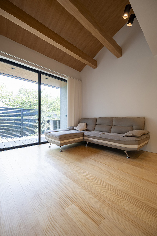 「遊び心と機能美を兼ね備えた大屋根の家」をテーマに、 リビングから見える道路沿いの並木道を見渡す事ことが出来るように配置計画をしております。 お施主様のご要望である「外観デザイン/インナーガレージ」「家事動線」「1階主寝室」「木の温もり」を設計段階から「デザイン・省エネ・コースト」の部分において細心の注意をしておりました。 インナーガレージや回遊の家事の動線、1階主寝室を設けることにより、 時短かつ効率よく生活が出来る計画とし、木の温かみが感じられるインテリア空間です。