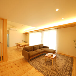 「中と外をゆるやかに繋ぐ家」がテーマとなっております。弊社オリジナル商品桧チップ入り漆喰壁と無垢のフリーリング・天井羽目板と自然素材をふんだんに使用しております。リビングと隣接しているウッドデッキは庇のある半外空間です。室内→ウッドデッキ→タイルデッキ→庭と緩やかな段差を通じて繋がります。 住宅で暮らす人の過ごし方を考え、キッチン・洗面脱衣室・WCL・寝室と回遊できる動線を採用し、リビングと隣接する小上がりのヌックスペースを設けました。アールの垂れ壁を設けることによって、秘密基地のようなおこもり空間となりました。