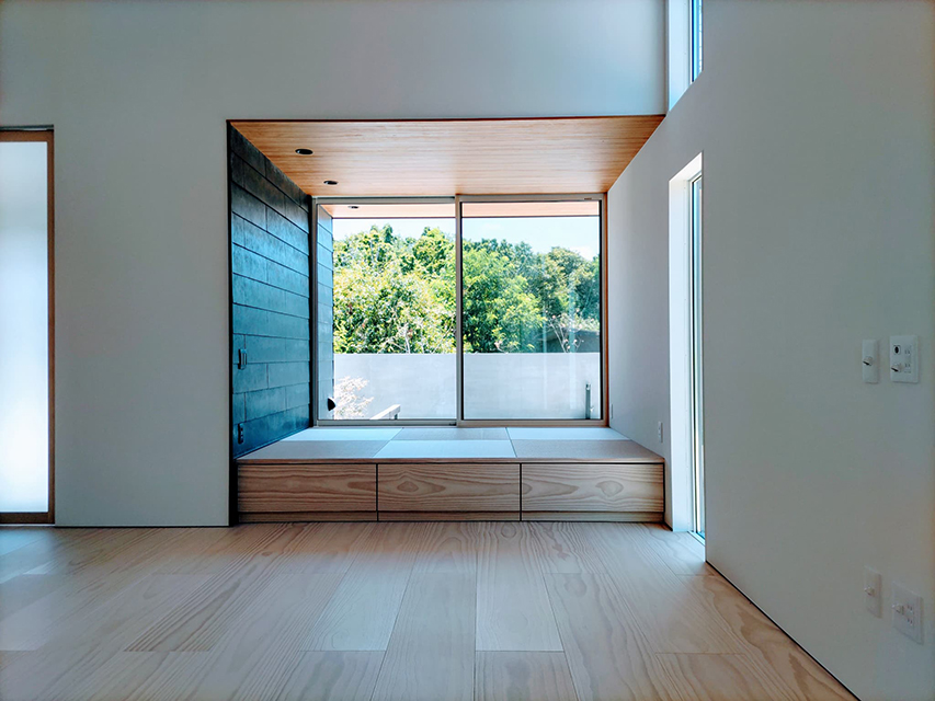 設計上、工夫されたポイント:南面にある大きな庇。玄関の庇とアウトドアリビングの日除けを兼用したw6500×D1200の超大型サイズ。 軒天と袖壁を高耐久ヒノキ板で組み合わせる事で、スッキリとしながらも温かみを感じる事ができます。 アウトドアリビングに面した畳スペースが一番お気に入りとの事。 この内部と外部が繋がった不思議な空間に「リビングをとても広く感じます!」とお客様にも好評いただきました。 アウトドアリビングは、絶妙な高さの目隠しがプライバシーを守りながら安心してバーベキューなど楽しむことができます。 「深い庇と縁側」という古き良き日本の里山の風情を感じさせてくれます。