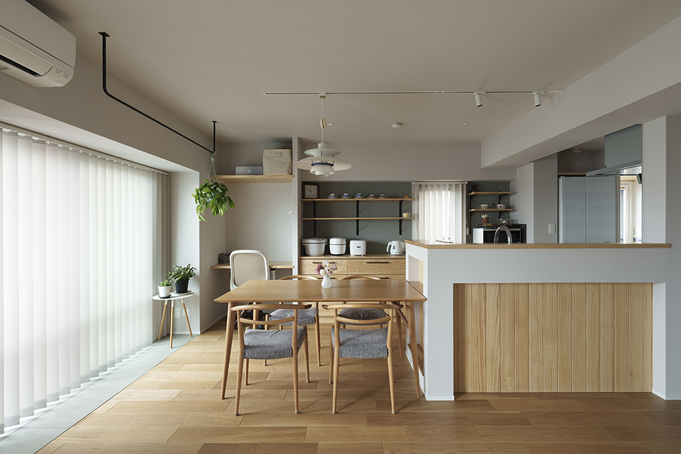 お子様が進学するタイミングでご自宅をリノベーション。熱がこもり暑かったキッチンや収納不足など、長年暮らす中で溜まった不満やストレスを解決し、暮らしを快適にすることにした。 和室を取り込んで広くなったLDKは、対面式キッチンにして解放感のある広い空間に。キッチンから洗面室へ、玄関からキッチンへと家事動線が良くなる回遊動線を設けた。大容量の背面収納とパントリーをキッチンに、リビングにも大きな収納棚をつくったのでLDKがスッキリ片付くようになった。 キッチン腰壁やニッチに木目を取り入れることで、より印象的なLDKに。 「シンプルなものや明るい木の風合いが好き」というお施主様の好みに合わせて、内装の色や素材類を数パターン提案。リビングダイニングのクロスやキッチンのタイルなどのアクセントに濃い色味を差すことで、明るさのある木目が引き立ち、さわやかな印象でありながら居心地のよい部屋に仕上がった。