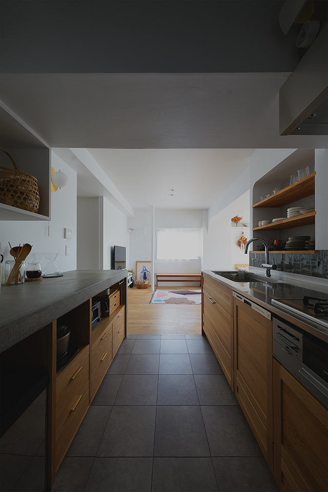 元のお部屋は、玄関及びホールがゆったりと計画された、3LDKの間取りでした。 一方で、大きな梁がお部屋を縦横にわたり、低いところでは床から1.8mのところもあるため、圧迫感を感じる要素もありました。 また、水廻りの設備・換気配管、RC壁など平面計画に制約をもたらす要素が散見されます。 お住み替え当初はご夫婦二人での暮らしですが、将来的なプランも考慮し、長大になっている面積を有効活用。さらに、上記の課題を考慮し計画を進めると共に、ご夫婦ともに在宅ワークのできる環境を設けられるよう、ご提案させて頂きました。