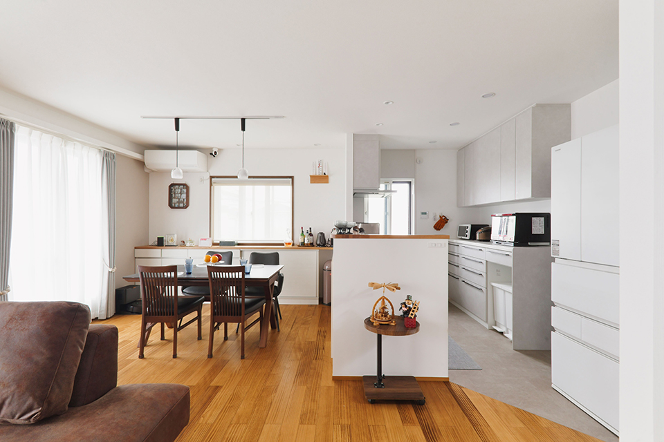 二世帯住宅 築30年 2階部分のみのリノベーション 1階にお母さま・2階に長男ご夫婦と娘さんの3人世帯(息子さん二人は独立) 当初のご希望は「キッチンは既存位置、住設の取り換えと床材・クロスの貼替」だったが、キッチン位置の変更・温熱環境の改善と音もれを解消するため、階段の引き戸設置 をご提案した。 LDKは廊下も取り込み、20畳の広さに。ウッドワンの無垢の床材やオークの棚板など、温かみのある素材を使い、居心地の良い空間になった。明るくなったキッチンはパントリーへの動線もバツグン。各収納部分はご要望と荷物に合わせたプランに変更した。 週末の料理は8割ご主人が腕を振るうとのこと。「新しいキッチンはすごく使いやすくなった」とご主人。 「今までとは別の家か?と思うくらい、素敵になった!動線が良くてさくっと片付くので助かる。いままで全然来なかった息子たちが、実家によく遊びに来るようになった」と奥様