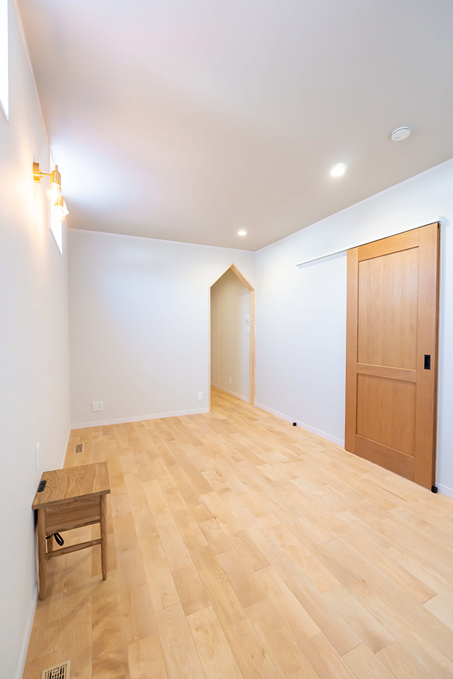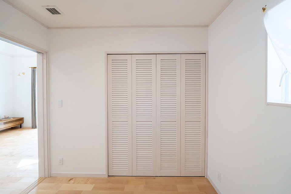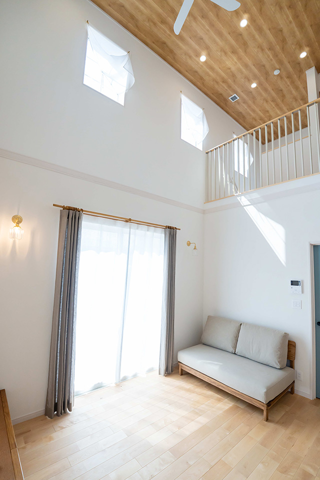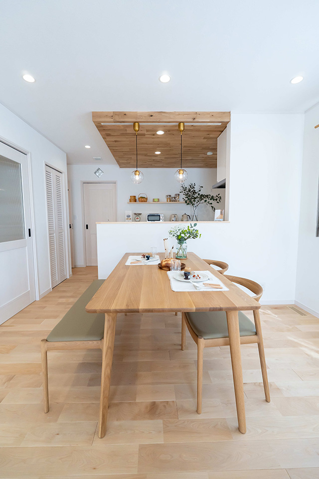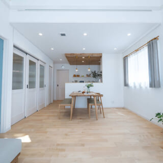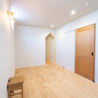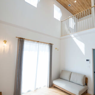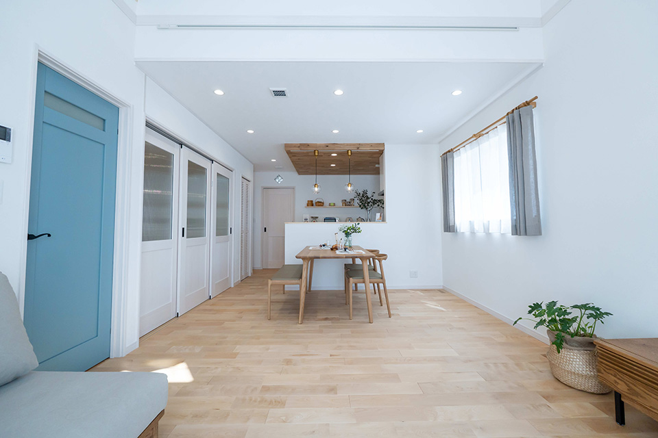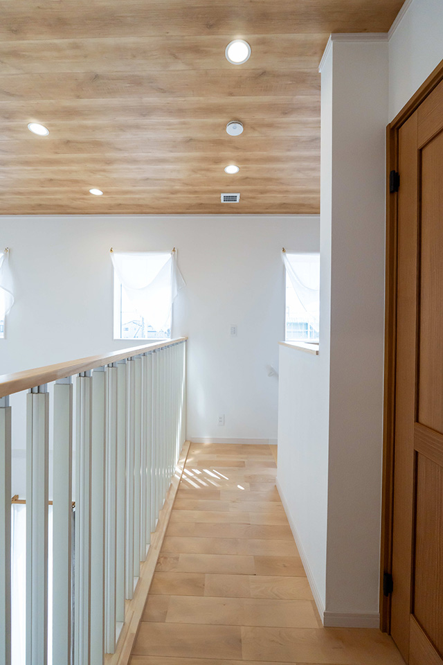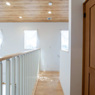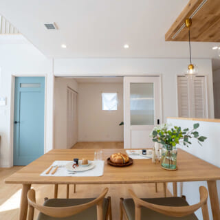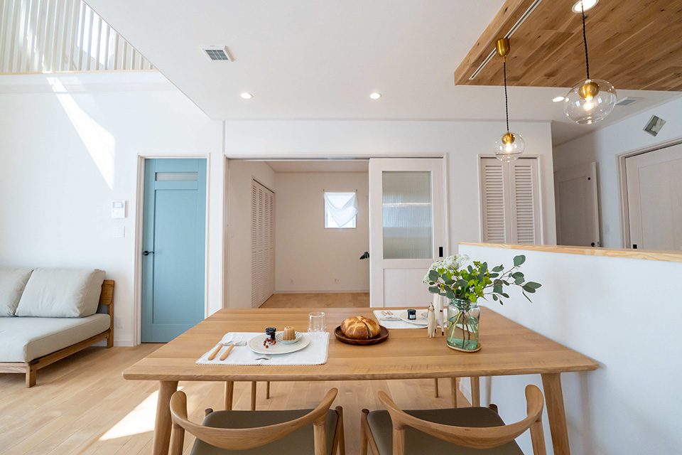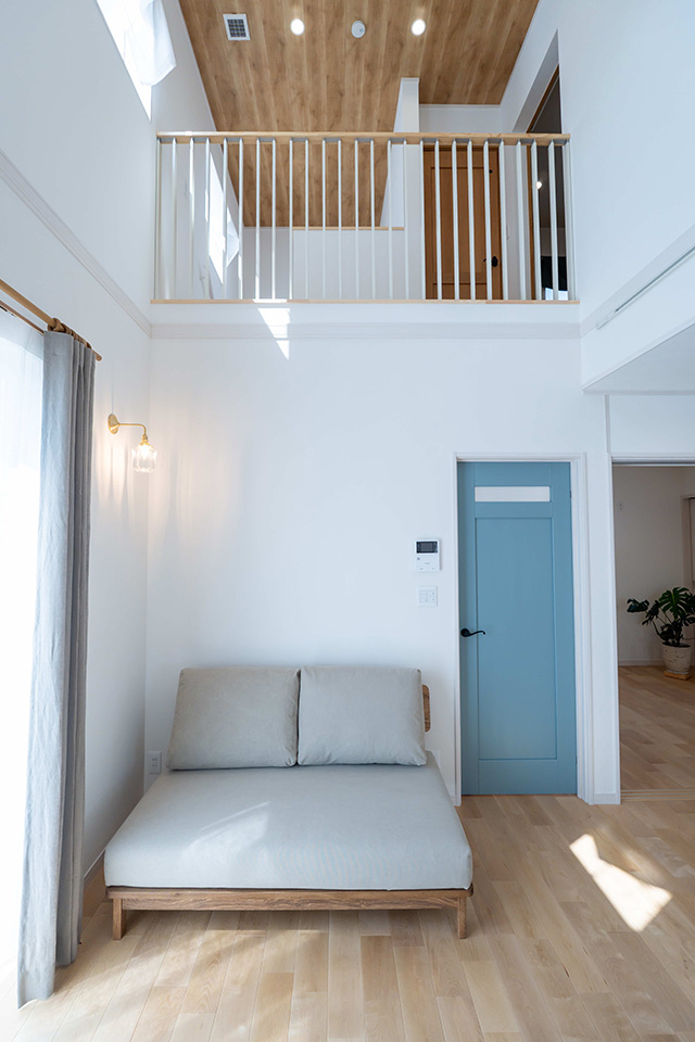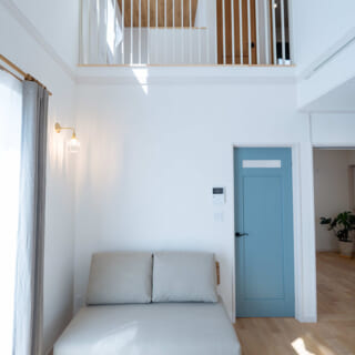 「かわいらしさ」と「心地よさ」が共存する住まいをテーマに、住まう人が毎日を楽しく過ごせる空間を目指しました。 建具、巾木、廻縁、吹き抜け手すりなど、細部にわたりウッドワンの製品を採用し、空間全体にやさしさと上質さを演出しています。 リビングの扉には水色をセレクトし、白を基調とした1階空間の中にさりげないアクセントをプラス。 2階の寝室や個室には落ち着きのあるブラウンの建具を採用することで、よりくつろぎを感じられる雰囲気に仕上げました。 吹き抜け部分の手すりは、空間の可愛らしさと調和するホワイトカラー。シンプルで洗練されたデザインが、全体の世界観を引き立てています。 全体を通して、色のバランスや素材感にこだわり、住む人の「好き」が詰まった、愛着のもてる空間が完成しました。