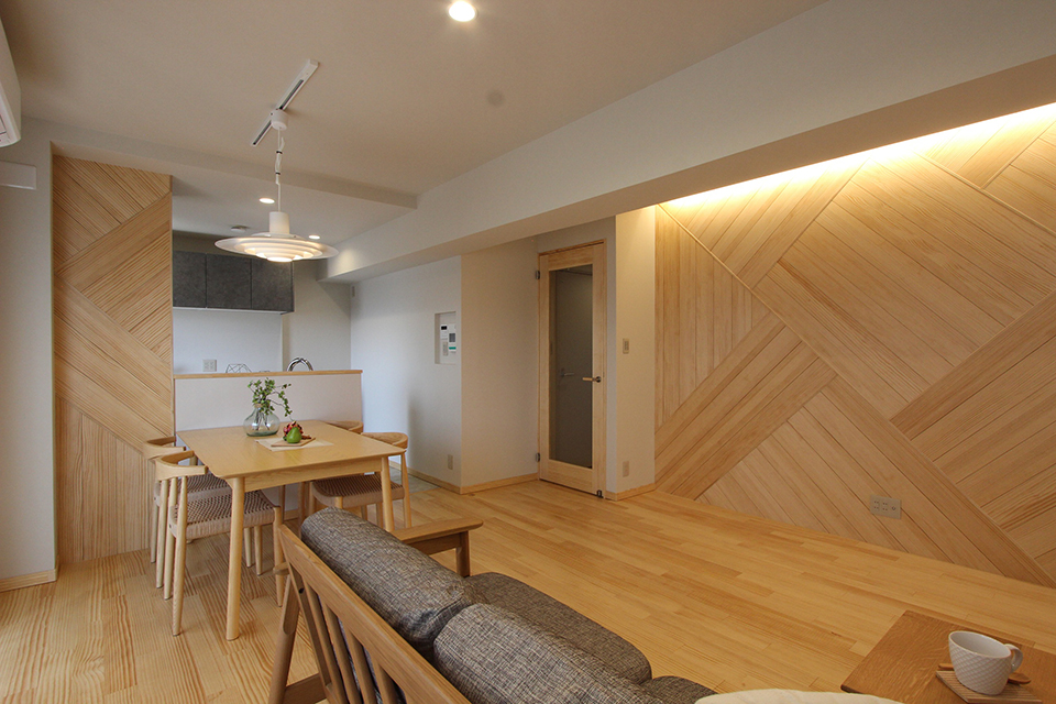 ダイニング・リビング・キッチンがコンパクトにまとまりながらも、空間同士が圧迫感なくゆるやかにつながり、日常動線に心地よいリズムを生み出している。無垢の床から続く壁面の斜めパターン貼りが視線を引き込み、空間に奥行きと動きを与え、デザインの主役として機能。差し込む自然光や間接照明が木肌に陰影を落とし、時間帯によって表情を変える。さらに、無垢材の経年変化を意匠の一部と捉え、住むほどに愛着が深まる空間設計に。視覚的な心地よさに加え、木の香りや調湿作用によるリラックス効果も期待できる。寝室2室には床と天井に無垢材を使用し、包み込まれるような安眠環境を実現。住まう人の感性に寄り添う、ナチュラルラックスな住空間を実現できた。