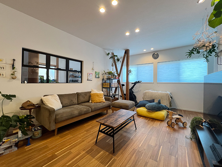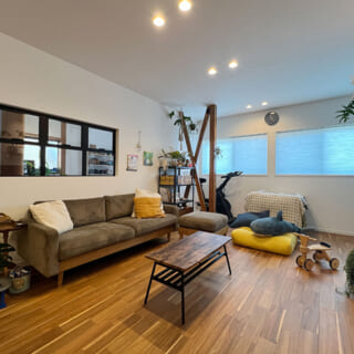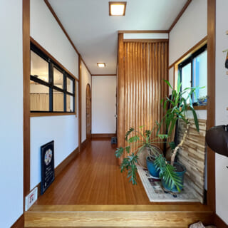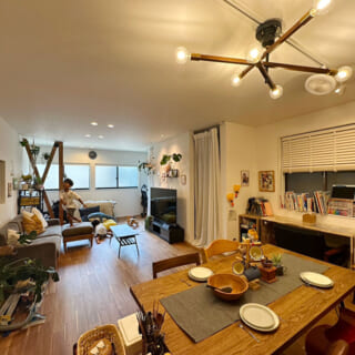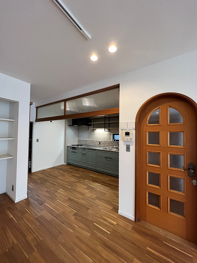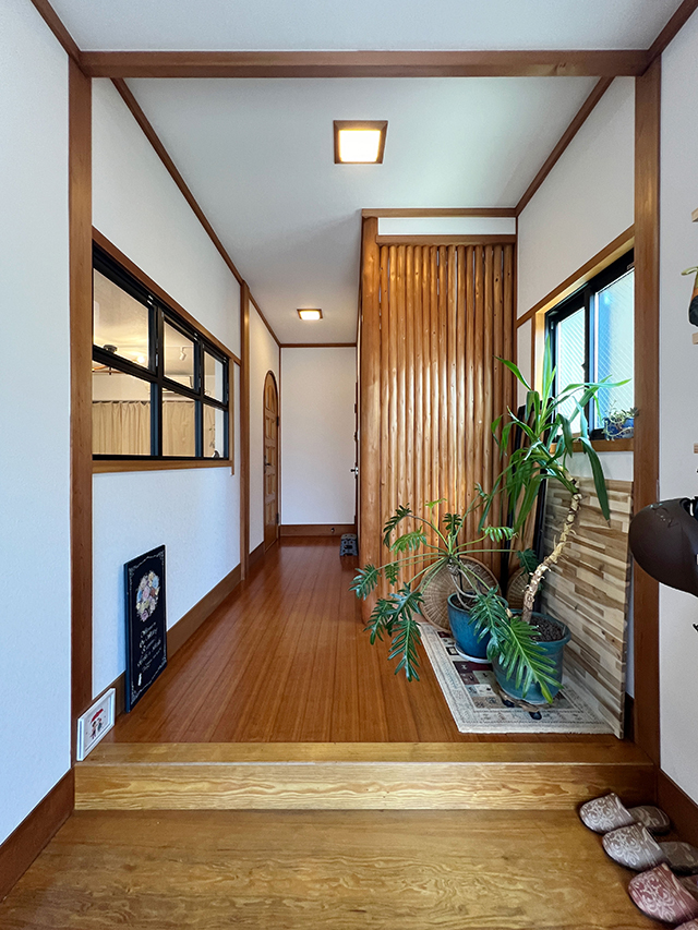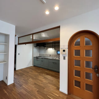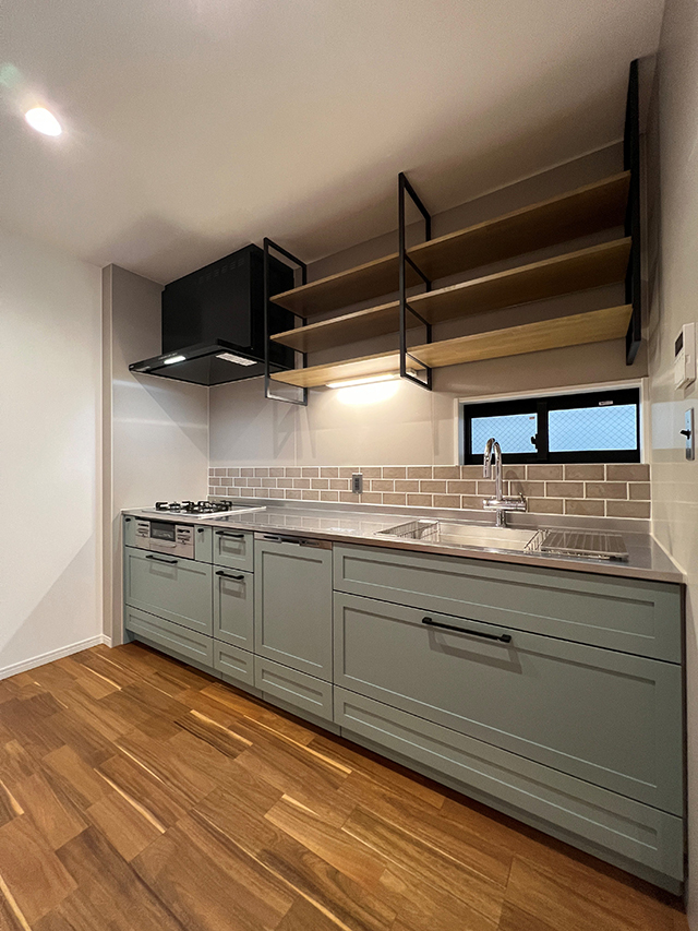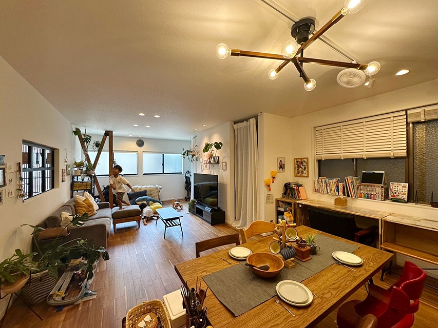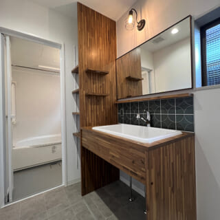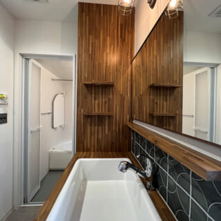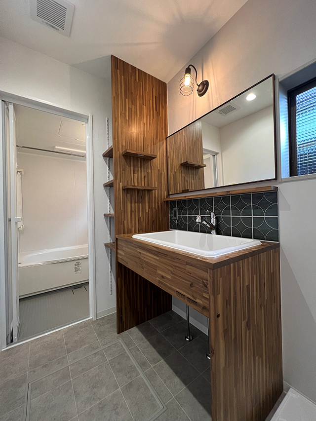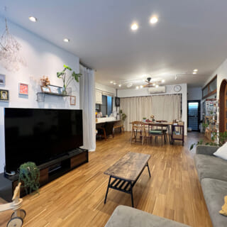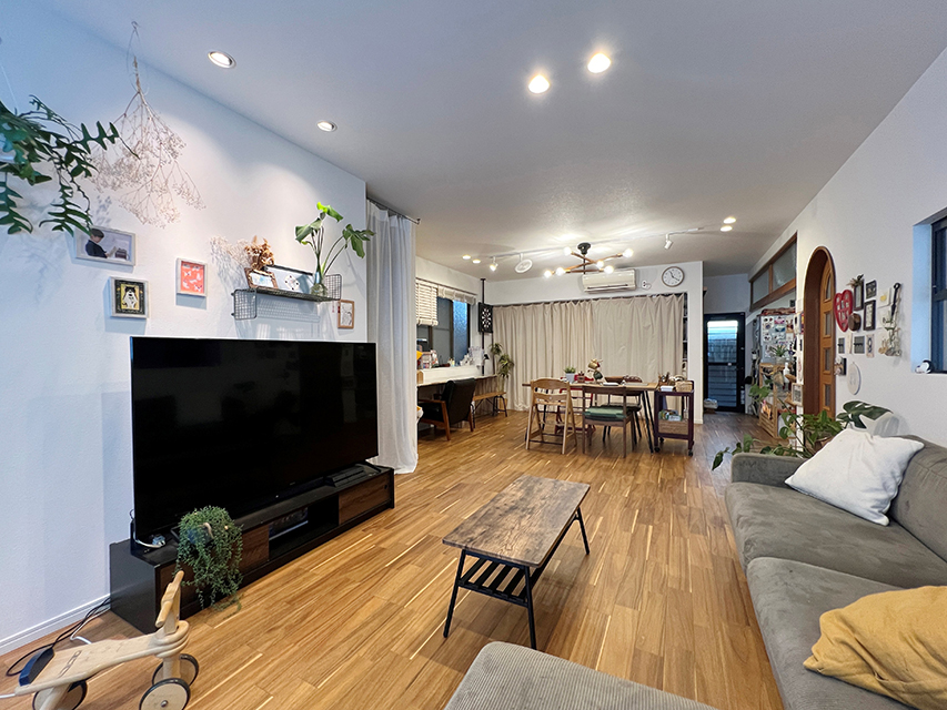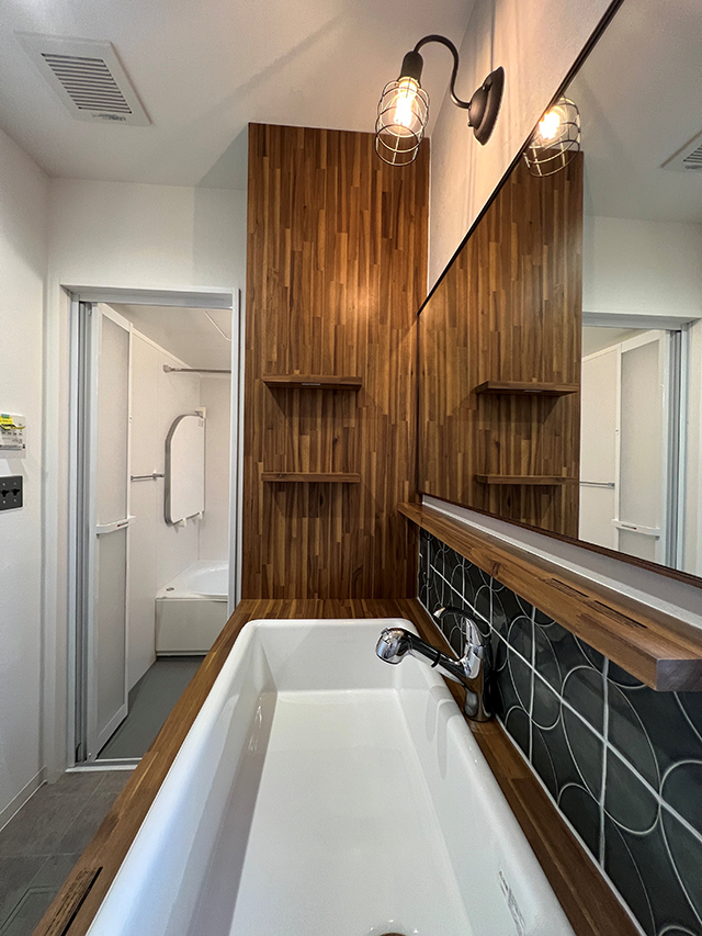 【テーマ】 新しい世代への引き継がれる家 【きっかけ】 遠方でお住まいだった息子様ご家族が空き家だった息子様の実家に戻ることになり、リフォームをすることに。 【ご要望】 水回り・外壁・屋根等の老朽化に伴い入替・メンテ。断熱耐震性能を上げ、かつ既存の良いところを生かしながら自分好みの理想の空間にしたい。 DKと和室を繋げて一つのLDKに。 ただ広くするだけではなく収納のことも考え、TVボードの背面にあえて壁を作り、回遊できるリビング収納空間に。リビングが狭くなりすぎず、かつ収納スペースを確保できる位置に壁を設け、また、壁に向け照明を入れることで空間のポイントに。 【お施主様の声】 造作洗面台とキッチンのタイルがお気に入りです。自分好みの家になって嬉しいです。