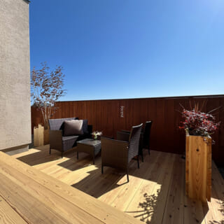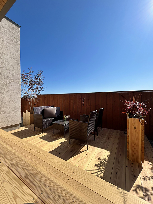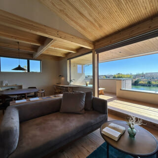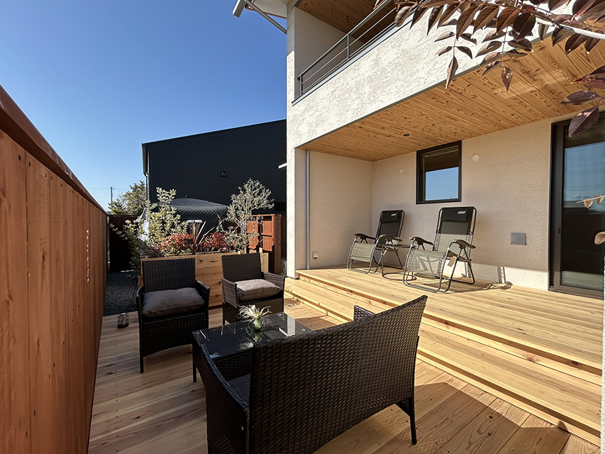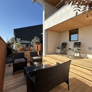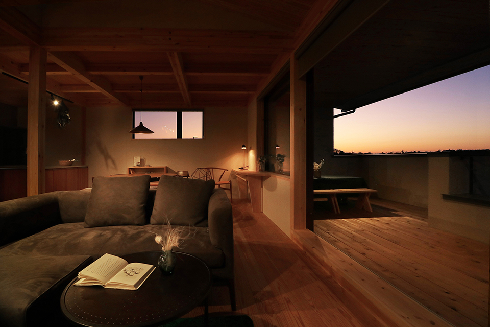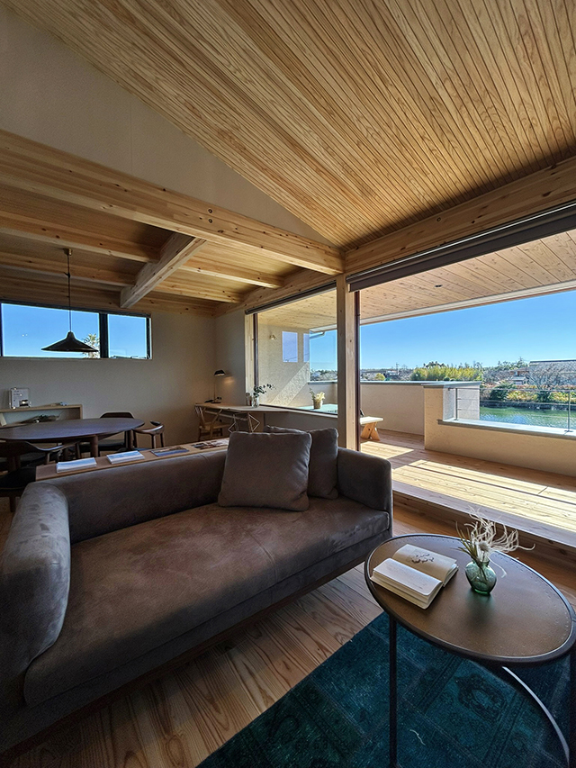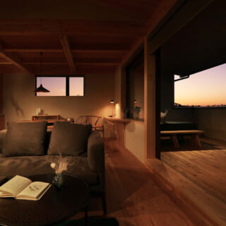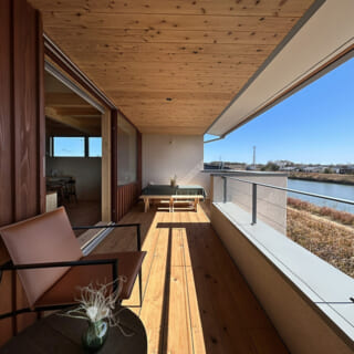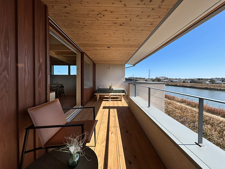 ゆるやかな流れに面した川沿いの住宅地。水面と空を眺める2階リビングには、軒深いテラスを設けもう一つのリビングとして日常的に使える空間です。寝室とバスルームが中心となる1階には、夕涼みを過ごすプライベートなテラスを設け、異なる趣きの二つのテラスをたのしめます。 庭のコーナーに設置したサウナテントと浴室の間でくつろぐ1Fテラス。広めの余白をのこし、堤防側からの視線を遮りながらも、光と風が十分に抜けるようにしました。