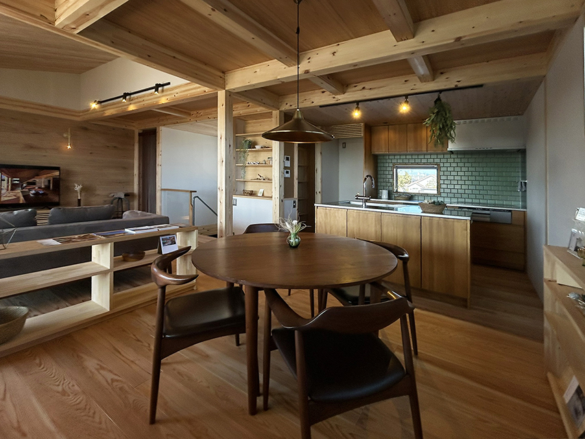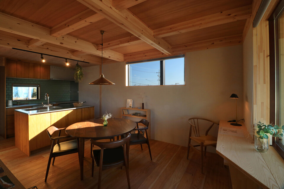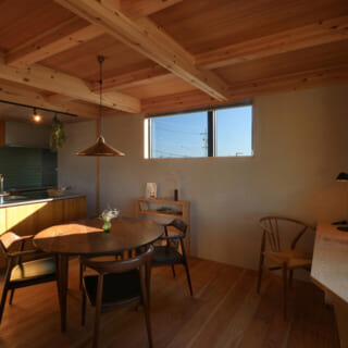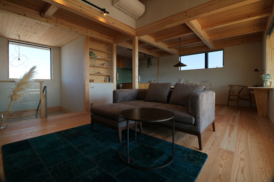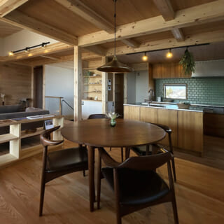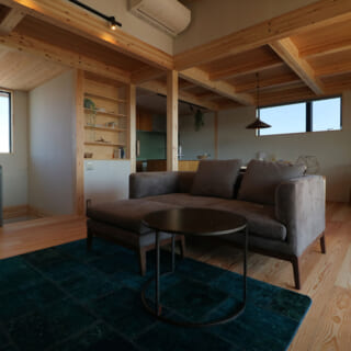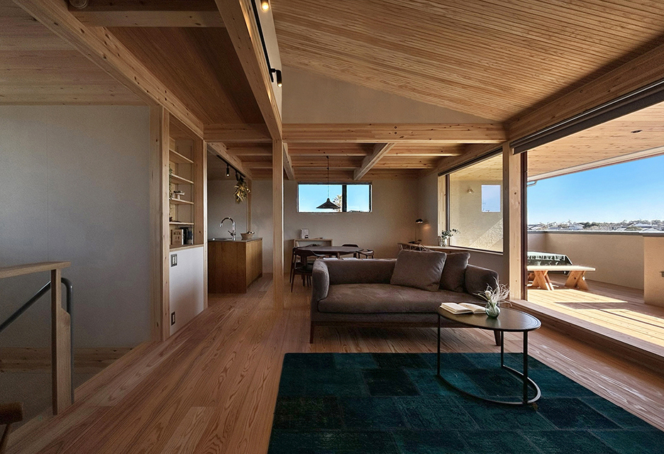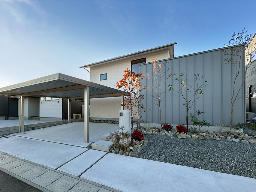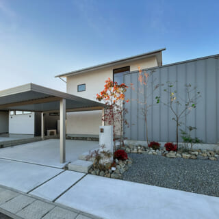 ゆるやかな流れに面した川沿いの住宅地。水面と空を眺める2階リビングには、軒深いテラスを設けもう一つのリビングとして日常的に使える空間です。寝室とバスルームが中心となる1階には、夕涼みを過ごすプライベートなテラスを設け、異なる趣きの二つのテラスをたのしめます。 庭のコーナーに設置したサウナテントと浴室の間でくつろぐ1Fテラス。広めの余白をのこし、堤防側からの視線を遮りながらも、光と風が十分に抜けるようにしました。