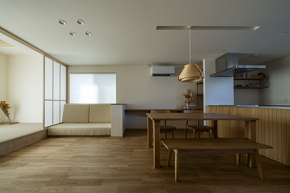 【居心地の良い 和と調和した暮らし】 深い軒と縁側が印象的な和風の住まい。 庭は日々の生活に自然の緑を取り入れながらも、プライバシーに配慮したデザインが施されています。縁側は、近隣とのつながりを感じられる心地よい空間に。玄関や窓の前には常緑樹を配し、外からの視線を遮ることで安心感を生み出します。 室内には、LDKと一体感のある小上がりの畳スペースを設置。襖で仕切れば客間としても活用でき、柔軟な使い方が可能です。さらに、造作ソファーやダイニング横のカウンターなど、暮らしに寄り添う工夫が随所に散りばめられた、落ち着きと機能性を兼ね備えた住まいです。 弊社モデルを3棟、異なるコンセプトでデザインし、その上で庭との繋がりを大切にし、町全体で見たときに各家が調和するような計画にしています。