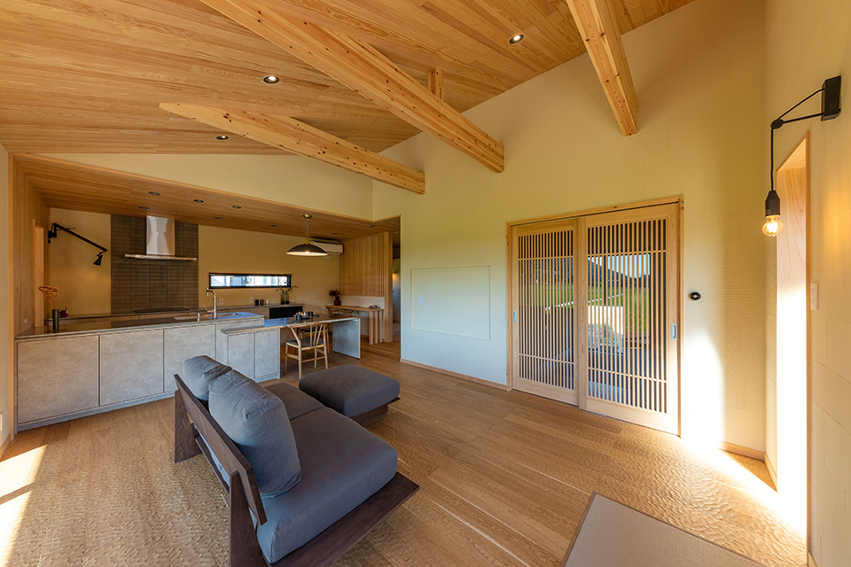 ▼お施主様の要望 必要最低限の広さで部屋を間仕切りたくない 自然を満喫できる憩いの空間にしたい 料理が楽しくなるようなキッチン空間 自然素材を使った周囲の景観に調和するような外装、内装 ▼苦心・工夫 ・美しい田園風景と桜並木、果樹園に囲まれた自然環境の整った美しい立地であり、それらを充分に活かしたプランとした ・廊下を無くし居室面積を極力確保することで生活動線がの効率化を図った ・LDKと就寝スペースは空間の連続性を保ちながら目線は通らない縦格子の簡易間仕切りで仕切り、基本的には1ルームとして活用出来る間取りとした ・ご友人と外でBBQを楽しみたいという強いご要望があり、外↔中(パントリーやトイレ)への利便性の高い動線を確保した。 ・南側の田園に向けて深い軒を出し、柔らかい日差しが心地よく入るよう工夫した。雨の日でも窓を開けて鎖樋を雨が伝う音等、季節や天候を楽しめる計画とした