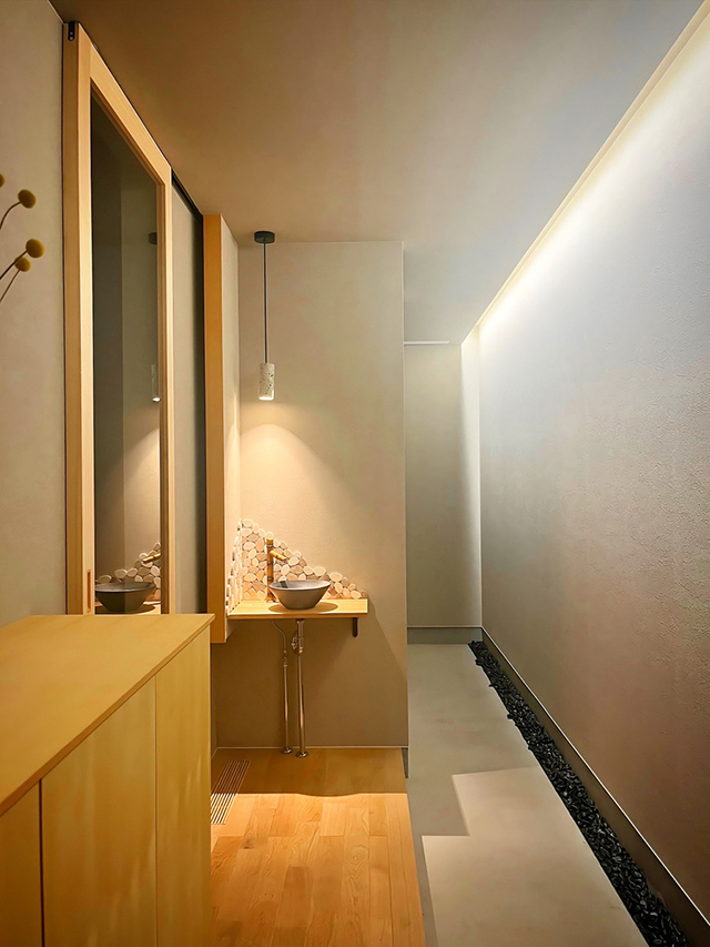 中庭を中心に、自然と調和するように設計した、和の平屋。 四季折々の風景を室内から臨み、光や風を感じながら、豊かな時間を育む暮らしを実現。素材には、木・和紙・竹・畳などの日本の伝統的な自然素材を随所に用い、落ち着きと、ぬくもりのある空間を演出しながらも、透明のドアや黒を取り入れ、現代での「カッコいい」も追及。さらに、ロの字型平面という、回遊できる間取りとし、日々の生活の中にも遊び心生まれる動線を計画。伝統と革新が共存する社会の中で、静けさの中にこそ、豊かさが息づく。そんな、現代の日本の姿を、住宅で表現した。