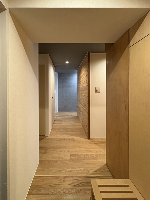 事務所のリフォームです。以前はトイレと湯沸のみの設備だったものを、住宅としても使用できるよう、キッチンやバスを組み込んだリフォームとしています。水廻りをコンパクトに納めることで、事務所空間は以前よりゆったり使用できるようになりました。以前に使用していたモデュール化された収納ボックスはレイアウトを変更し仕切りとして再利用しています。床材はキズが目立たないよう、オビノコ加工のコンビットモノ挽板足感フロアを採用しました。一部壁には端材として工務店の倉庫に眠っていた数種類の無垢板をランダムに張ったり、厚みのある杉板を使用しています。