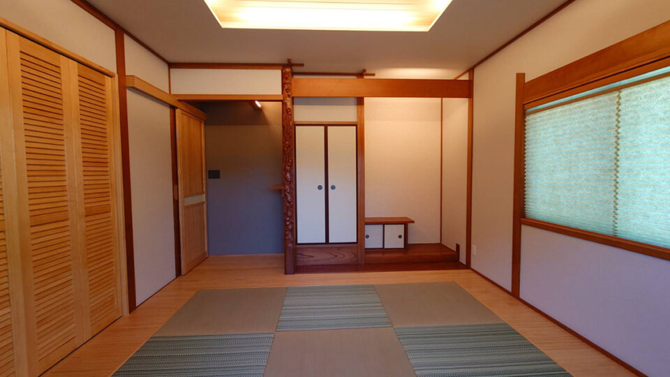 「使われなくなった和室を、再び心地よい空間へ」 暑くて寒く、そして薄暗かった和室を再び使える状態に戻すため、温熱環境の改善と内装の模様替えのご依頼をいただき、 打ち合わせを重ねるなかで、単なる改修にとどまらず、玄関ホールとの繋がりや使い勝手にも配慮した、より快適な住空間へと発展させることにした。 間取りを一部見直しつつ、床の間廻りの趣はそのままに、「ずっと居座っていたくなるような和の空間」を目指し、既存の内装建材がすべて無垢材で構成されていたため、新たに使用する建材も無垢材を基本とした。 床や建具には経年変化を楽しめるピノアースを採用し、畳には一部天然素材を使用することで、自然素材ならではの温かみと風合いを大切にし、明るさとプライバシーの両立を図るためツインタイプのプリーツスクリーンを採用すると同時に、光源が直接見えなくとも空間全体がやわらかく明るくなるような照明計画を提案した。