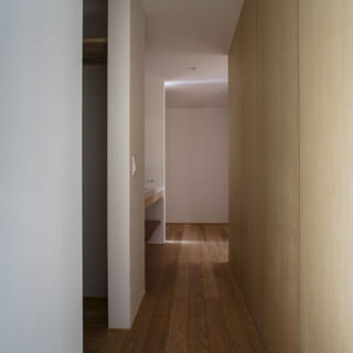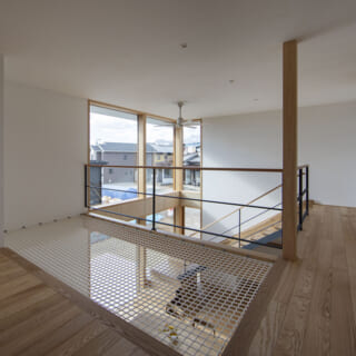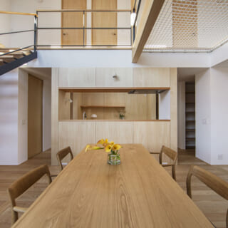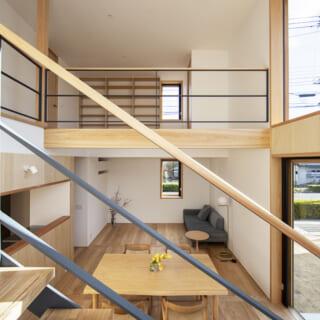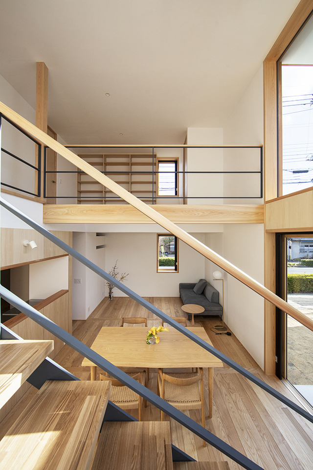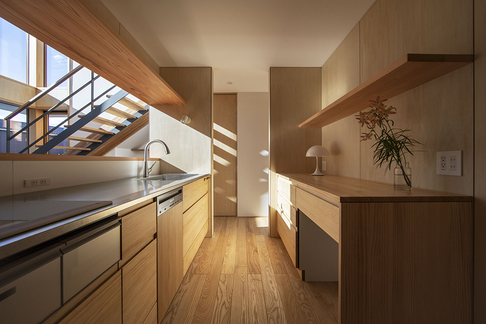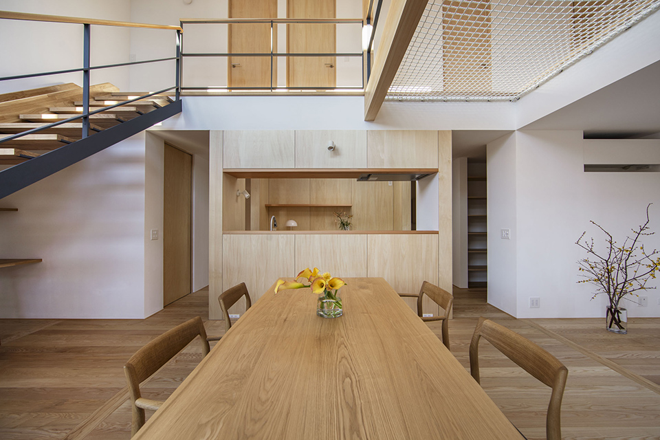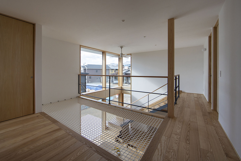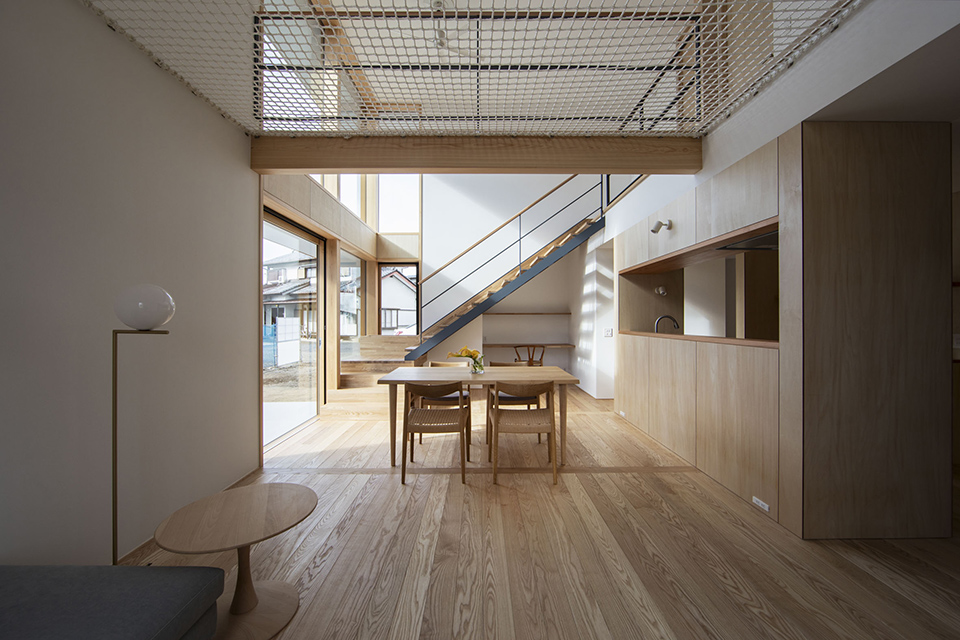 【桐生の家】 桐生市街地のバス通り沿いに建つ2階建ての住宅。 切妻屋根の軒の出のないシンプルな外観に、視線の抜ける南西側に木製サッシを設えた。 吹抜を挟み2層分の大きな開口部。軒の出のない形状でも日射をコントロールするため、1階・2階それぞれに奥行の深い庇を設けている。 キッチンを中心に回廊型の廊下を配し、仕上げをシナベニヤ張りに。 シナベニヤの箱を中心に、水廻りやWIC、リビングへぐるりと廻れる行き止まりのない動線を確保。 タモの無垢床に、壁・天井はすべて漆喰ローラー塗り仕上げ。 階段の横にはすべり台があり、吹抜上部にはロープネットも。 こどもたちの遊び場としてはもちろん、大人の昼寝スペースに。 ハンモックのように身体を預けてリビングを見下ろす感覚はちょっと新鮮。 ご夫婦とこども3人で家じゅうをワンルームの様にして暮らす大らかな家。 UA値:0.39・竣工時C値:0.37・耐震等級3
