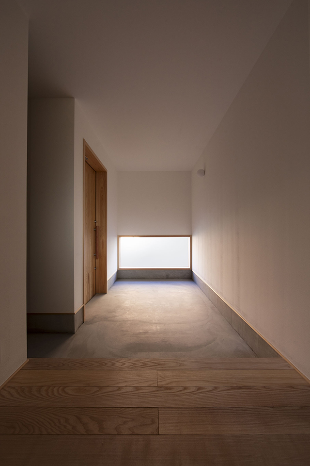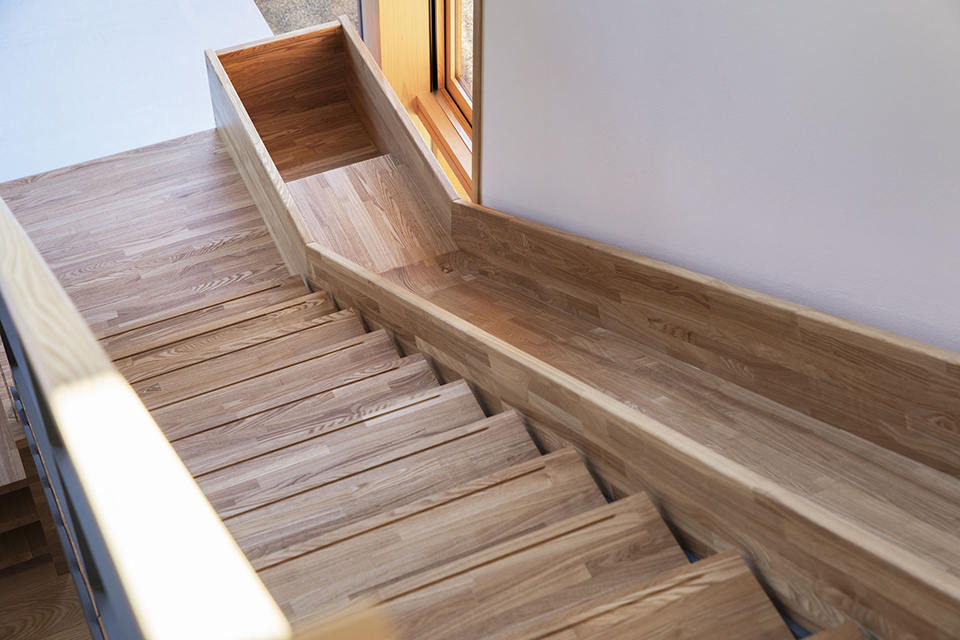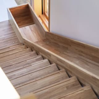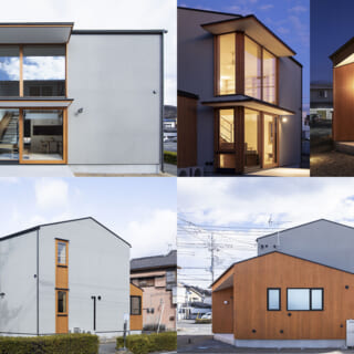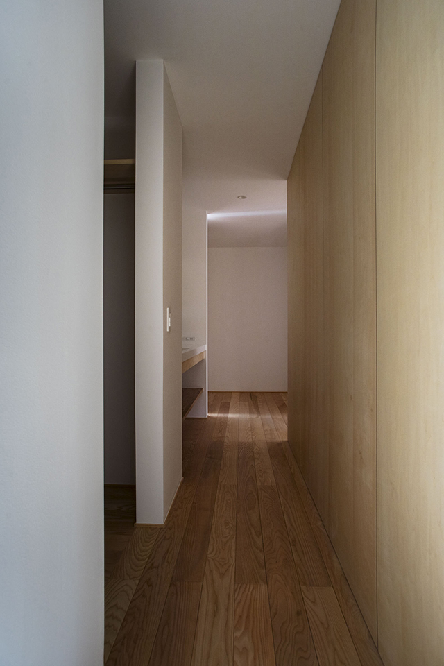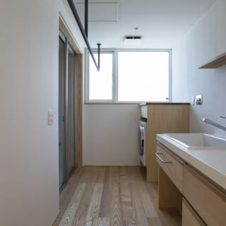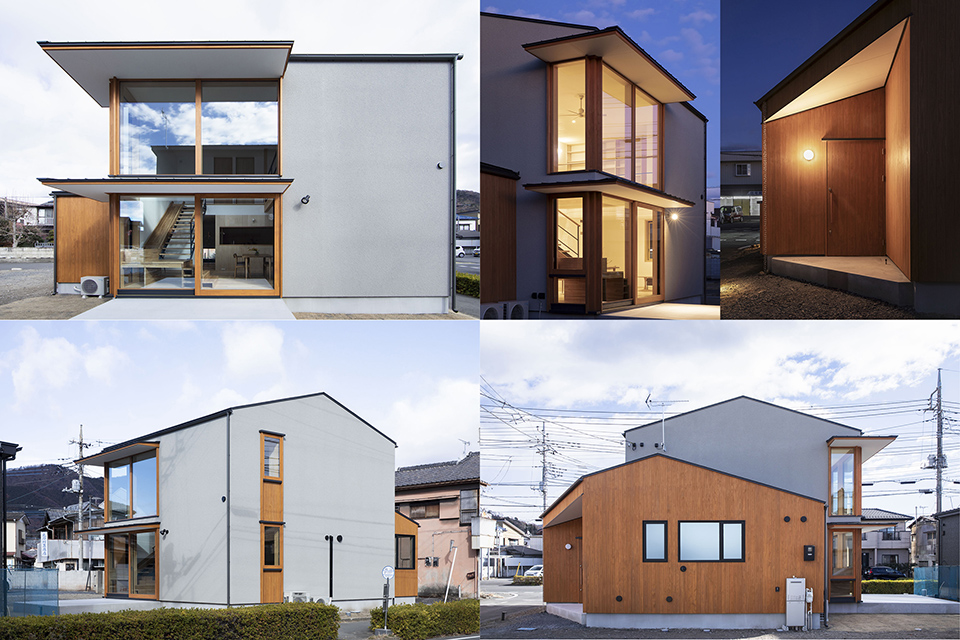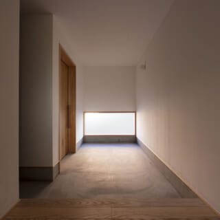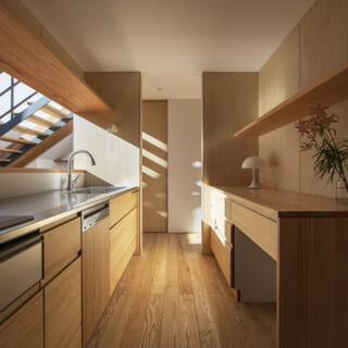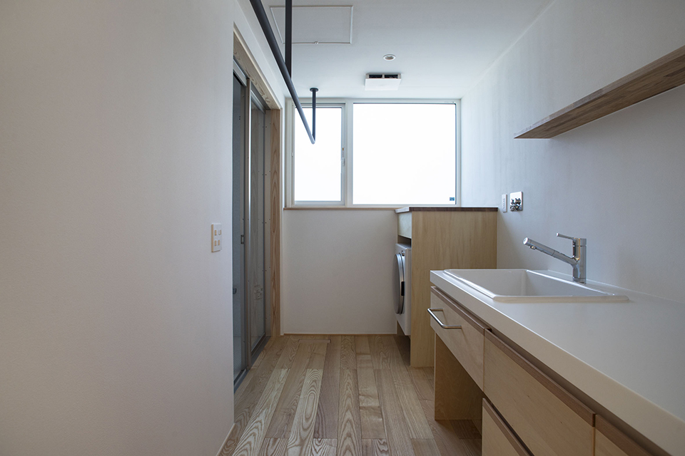 【桐生の家】 桐生市街地のバス通り沿いに建つ2階建ての住宅。 切妻屋根の軒の出のないシンプルな外観に、視線の抜ける南西側に木製サッシを設えた。 吹抜を挟み2層分の大きな開口部。軒の出のない形状でも日射をコントロールするため、1階・2階それぞれに奥行の深い庇を設けている。 キッチンを中心に回廊型の廊下を配し、仕上げをシナベニヤ張りに。 シナベニヤの箱を中心に、水廻りやWIC、リビングへぐるりと廻れる行き止まりのない動線を確保。 タモの無垢床に、壁・天井はすべて漆喰ローラー塗り仕上げ。 階段の横にはすべり台があり、吹抜上部にはロープネットも。 こどもたちの遊び場としてはもちろん、大人の昼寝スペースに。 ハンモックのように身体を預けてリビングを見下ろす感覚はちょっと新鮮。 ご夫婦とこども3人で家じゅうをワンルームの様にして暮らす大らかな家。 UA値:0.39・竣工時C値:0.37・耐震等級3