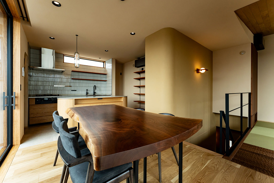 旅館のような癒しの空間を目指し、木の質感と多彩な素材の経年変化を楽しめる住まいをテーマにした。アプローチの木格子から玄関のなぐり板張りのドアを開けると、広い土間と畳敷きの廊下が続き、簀戸や古建具で仕切られた和室が、非日常の和の空間を演出する。 1階は客間としても使用できる存在感のある和室、落ち着いた照明に拘りの器具が映える質感のある壁が続き、ゆとりある水回り空間へと繋がる。 なぐり仕上げの階段を足裏でその質感を感じながら上がると、開放的なLDKが広がる。 2階は家族の日常生活の場でありながら、客人を驚かせ、心を解き放つコミュニティの場としても機能する。アール壁面の柔らかな印象、石壁、そして力強さを感じるなぐり加工の床や畳といった各要素がその質感と共にくつろぎの空間を創り出している。メインのキッチンは木の風合いを活かした質感で多彩な要素が共存するLDKの中で確固たる存在感を放っている。