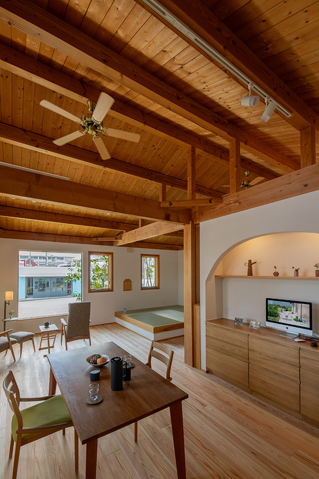 テーマ:“謳歌する平屋” 季節の移ろいを感じながら、おおらかに住まう。 好きなもの、大切にしたいものだけに囲まれた、地に足のついた暮らし。 壁や仕切りは最小限に、心地よく丁度良い空間で、私たちだけのストーリーを描く。 佐賀に所在する事務所をリノベーションし、平屋のモデルハウスとしてオープン。 壁付けのキッチンと、オープンな小上がりの和室、コンパクトな間取りでも広がりを感じることができる、足りない分なものもない、ちょうど良い住まいです。 和室は、寝転んで寛いだり、来客の宿泊スペースなど、フレキシブルに活用できる場所です。子どもが大きくなったら個室にするなど、家族の成長に合わせて家も変化させることができます。