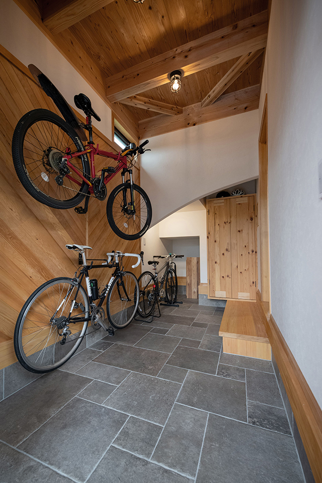 見晴らしのいい高台の住宅地に佇む、真っ白な漆喰と緑屋根のお家。施主の一番の要望は薪ストーブを取り入れることだった。ご夫婦お二人で仕上げた土間にはお気に入りの薪ストーブ。吹き抜けが広がる大空間のリビングダイニングは杉の床がサラサラして気持ちいい。 キッチンに合わせて壁面にはブリックタイルやステンレス施し、マグネットで調理器具を吊り下げ使いやすさも実現した。2階の小上がりの畳空間では、外の景色を見ながらボーっとくつろいだり、花火大会も楽しむことができる。 夏は窓を開けるとスーッと風が通り抜け爽やかな木の香りも広がる。冬はもちろん薪ストーブを満喫。夜はテレビではなく火を見て過ごす習慣がついたという。 「本当に好きなものだけを、大切に使い続けて暮らしたい。」そんなご夫婦の清らかな心持ちを受け入れてくれる空間となった。