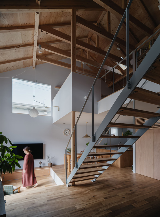 〈作品のテーマ〉:「多様な自由空間と木のぬくもりを感じる住まい」 家族がどの場所にいても、大きな吹抜を介してゆるやかにつながるように計画しています。また、どの場所に居ても木のぬくもりを感じられるように床、キッチン、収納、扉、天井、小屋組み架構には木材を採用しています。 1階と2階が上下でつながるワンルームのような自由な開放感を追求しており、7mの天井高さがある木材現しの天井、小屋組み架構が象徴的な屋根の下の居場所、リビングの一部が下がった自由な居場所等が、用途を制限しない自由な空間となっています。 家族の気配を感じながら、それぞれが自由に過ごせる居場所が点在し、部屋全体が柔らかな光に包まれた木のぬくもりを感じる住まいとなっています。