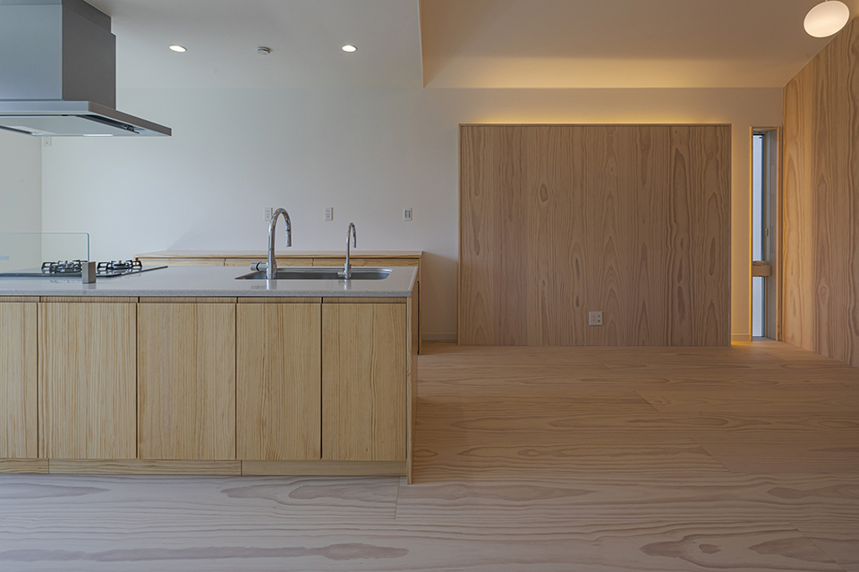 外観は切妻屋根が美しい、上品な色味の和モダンを表現しました。LDKは切妻屋根をそのまま利用した勾配天井とし、内部からも切妻屋根の美しさを感じることができます。LDKの入口にはWOの両引戸をクリアガラスで採用することで冷暖房効率を考慮しつつ、家族の気配が感じられるような間取りとしました。床材としても採用しているWOをそのまま壁面に張り上げる事で、天然木に柔らかに包まれ、気持ちが和らいでいく、そんなリビング空間を計画しました。間接照明が壁上部を照らすことで木目の美しさを引き立て、天井上部から垂らした丸い照明の光が木のぬくもりをより一層暖かく感じさせます。