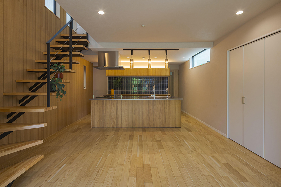 物件コンセプトは『雅』です。洗練された古風な美意識をテーマに、外観は和モダン、内部空間はジャパンディなインテリアが合うような空間デザインを計画しました。外観は瓦屋根や日本伝統工法のささら子張を取り入れ、木目を生かしつつ、消炭色の塗りと合せる事で、落ち着いた色味の大人な和モダンを表現しました。外観からの和のイメージのまま暮らして欲しいと思い、LDKは木を主役とし、無垢の木のキッチンを据え、ダイニング壁一面に木材を張り上げました。差し色でキッチン背面に藍色のタイルを貼り、木のぬくもりを感じつつ、現代住宅らしいメリハリのある空間を心掛けました。木の空間の心地よさと、リビングイン階段にし、家の中心がLDKになる事で、家族のコミュニケーションを深められる環境を整えました。片持鉄骨階段を採用することで空間に抜け感と広がりを感じさせ、階段上部からはダイニングへ光が差し込むような設計としています。