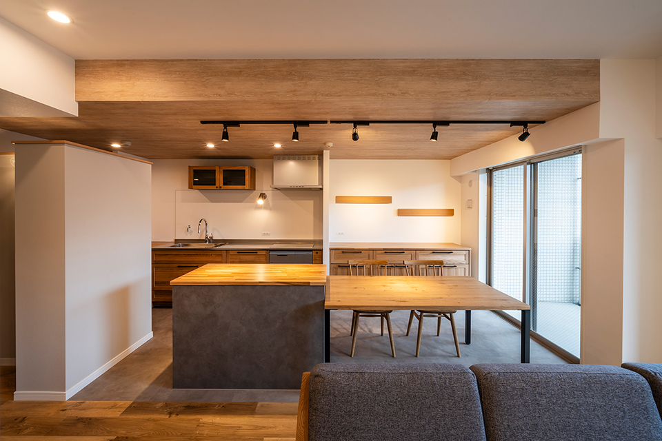 DEARHOMEの過去の事例をご覧になり、DEARHOMEデザイン設計にほれ込んでいただき 一年越しの物件探しの末、念願のカフェスタイルでリノベーションしました。 もともとは【キッチン】【リビング】【洋室】とそれぞれが間仕切りで区切られていた空間でした。 リビングを中心とした生活で、家族が集まる空間となるように広く設計。 フリースペースには室内窓もあり、どんなシチュエーションでも家族の顔が見える空間になりました。 リノベーションのメインとなるキッチン空間は特に「木の質感」にこだわりプランを進めていきました。 お施主様の木目が好きということで、ウッドワンのキッチンをご提案。 同じデザインのカップボードを横並びで設置し、使い勝手と収納量がアップしました。 カップボードの上は、お子様の作品を飾れるギャラリースペースにして、リビングからいつでも眺められるようにしました。