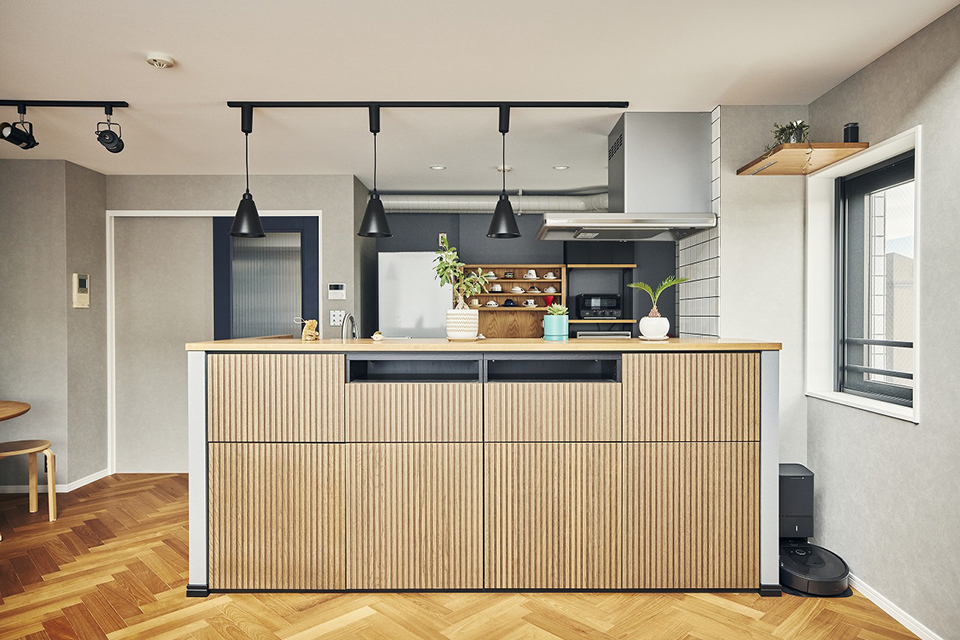 メゾネットの中古マンションを購入し、念願のフルリノベーション。内装はロンドンのホテルをイメージし、「リビングが見渡せるようなキッチンにしたい」とのご要望から、壁付けだったキッチンを対面式に変更。木の質感に一目ぼれしたという「SU:IJI」に既製品のカウンター収納を組み合わせ、好みのデザインと高い収納力を両立。さらに壁に沿ってL字形にカウンターを造作し、お手持ちの食器棚と合わせて、コの字形キッチンのような動きやすさと機能性を確保。洗面台も木を基調とし、「アイロンがけができる場所が欲しい」とのご要望から、カウンターをL字形に延長。寝室にはオープンクローゼットを設け、必要に応じてカーテンで目隠しできる仕様に。2階のセカンドリビングは「音を気にしなくてよい部屋」として、趣味の音楽を思い切り楽しめる空間に仕上げた。