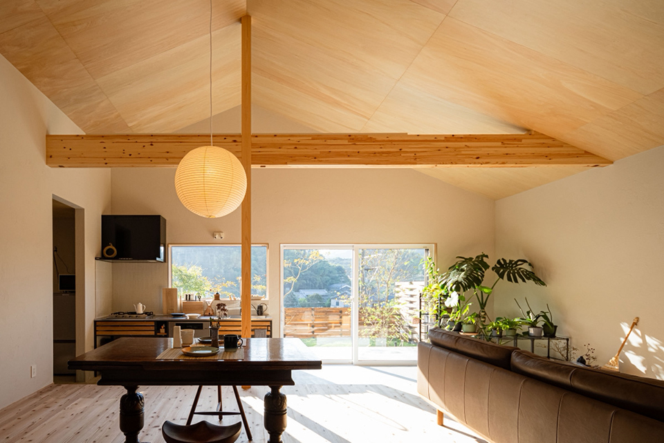 自然を楽しむ、季節と生きるということをテーマに家づくりがスタート。 選んだ土地は松山市吉藤の山間地。周りには山々とみかん畑が広がる場所で、 その美しい景色を楽しみながら暮らしたいという要望だった。 ウッドワンのフレームキッチンと、無垢の木の収納TVボードを採用。 夫婦ともに広島県出身のため、どうしてもウッドワン製品を採用したかった。 2022年夏ごろ、ウッドワン広島ショールームを見学。その際、フレームキッチンに惚れ込み、いつか家を建てることになったら使いたいと話していた。観葉植物が趣味であるため、LDKの南側に土間を設け、土間*アイアン*グリーンで空間を作った。 季節や時間帯によって表情を変える空間づくりを意識した。