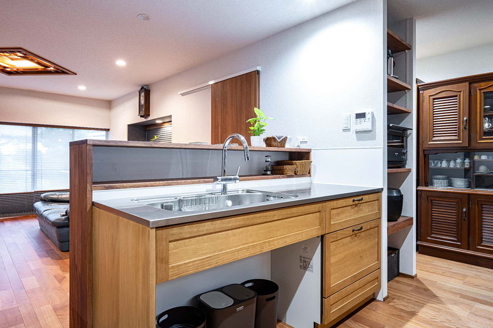キッチンスペース的にダイニングをキッチン前への配置はLDKスペースを損なうためキッチン横にダイニングを設置せざるを得ないことやまた、ペニンシュラでは上記要件を満たせず、Ⅱ型キッチンに絞らざるを得ない条件でした。 パントリー設置やピアノスペースにリビングからスルー可能にするなど既存構造(柱)を確認しながら間取り変更、配置には苦心しました。 ヒアリングと現地調査を行った際にウォールナット調、チーク調が好きで木製に溢れている既存家具も多く、一目で「スイージ」の似合う家だと確信しました。同時に建具も木目がきれいなドレタスを推奨させていただきました。