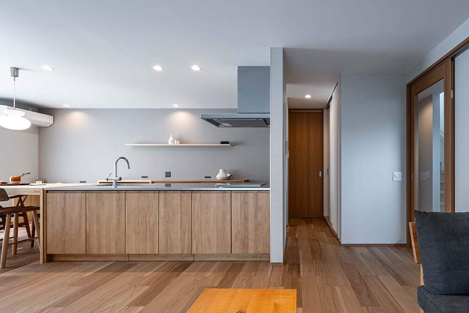 「雨を詠う 日々の恵みをあじわう暮らし」がテーマな規格商品 プラン、建材をエディットし、より田舎の田園風景に似合うようアレンジしました。 和風テイストが好きなお施主様に居室には合板天井などを施し、 建材は主にウッドワン製品で仕上げました。(キッチン、階段、建具、枠、巾木、框、下駄箱) ※規格品の標準建材ではありません 山々に囲まれ、加工が得意な工務店の特性を生かし、 シナベニヤ、タモ、ラジアタパインでの造作物にウッドワン商品をうまく施しました。 (苦心したところ) ・造作したものとウッドワン製品とのトーン素材選び(基本オイル塗装での仕上げ) ・掘り下げ和室部を天井を下げ、サッシラインと合わせた ・2階各居室の勾配天井と収納スペースとの取合い ・2階各居室エアコンを隠蔽配管にするために一部天井を折り上げた ・キッチンパントリーを対面収納化