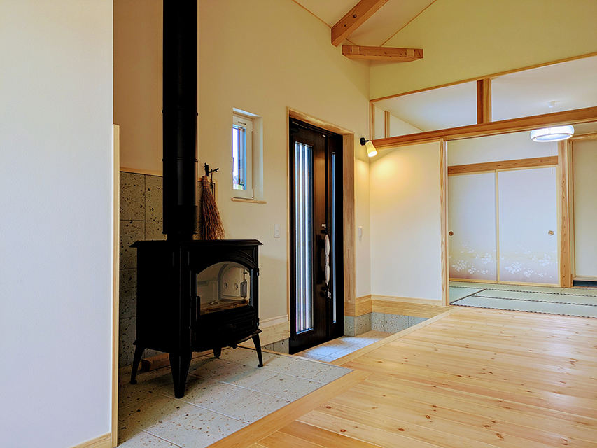 平泉の世界遺産、毛越寺に程近い場所で建築工事を行いました。 埋蔵文化財包蔵地の発掘調査から始まり、歴史景観地区内での外観の色や建築物の制限について、関係各所と打合せを重ねました。 最初に、奥様より間取りのラフスケッチを頂きました。イメージは大分固まっているようでしたので、これをどのように形にするかを棟梁と共に考えました。 ご家族の希望としては「日本の古き良き時代のものを使いたい。障子や襖など、建具屋さんが造った建具が好み。大正ロマンが好き。猫二匹が遊べる家にしたい。薪ストーブで暖かくしたい」とのことでした。 二階のホールや洋室まで薪ストーブ一台で暖めるために、玄関部分を吹抜けにし、薪ストーブの熱が回るようにしました。 和室は真壁で仕上げました。鴨居や窓台は構造材の一部としてプレカット加工し、その段階で建具の溝加工をしました。溝巾のミリ単位の打合せが難しかったです。