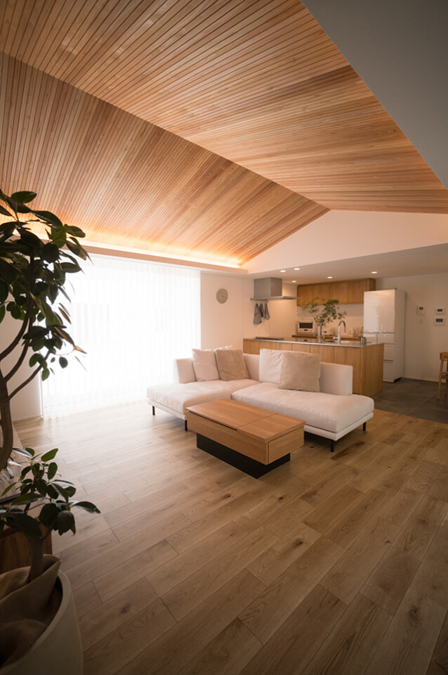 大屋根のコートハウス 私の家が立つ敷地は、東南西の三方が建物に囲まれているお寺の参道沿いの旗竿地です。旗竿地であること、参道沿いに土地があること、それらの条件を踏まえ、ひっそりとたたずむような建物を計画しました。 ファサードについては周辺環境に配慮し、隣の古い家屋と屋根勾配を揃えて、街並みに寄り添うよう配慮しました。 内部空間については、日射が入りにくい土地だからこそ、空からの光や壁の反射光、そういったものを有効に活用して陰影のある柔らかい光に包まれた空間にしました。主な採光は北側に設けた中庭になります。中庭の上部は、屋根もくり抜いているため、季節によって日差しが中庭まで入り込み、その反射光が室内に導かれるような計画になっています。時間や季節によって光の入り方、中庭の落葉樹の見え方が変わり、住宅地でも季節感を常に感じることができる内部空間となりました。