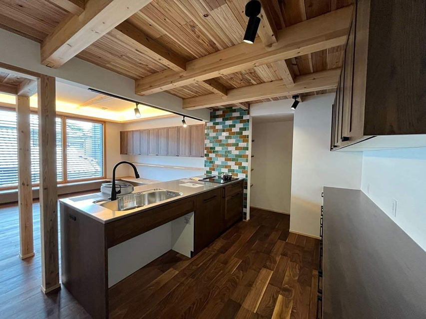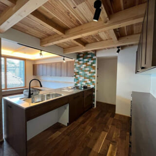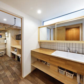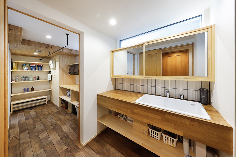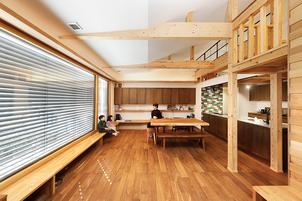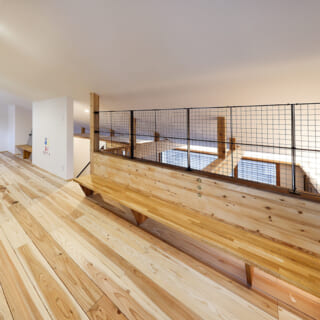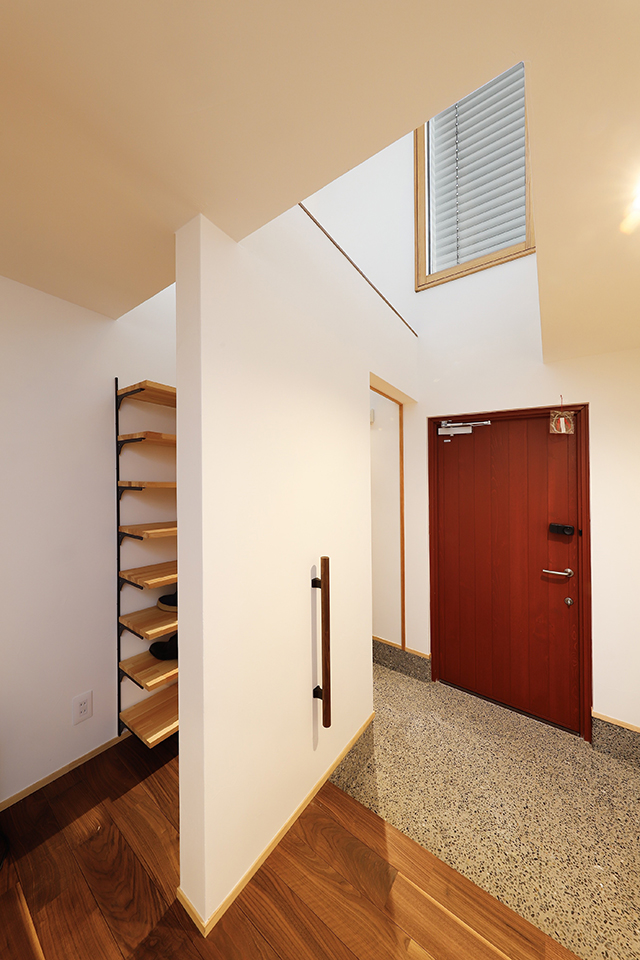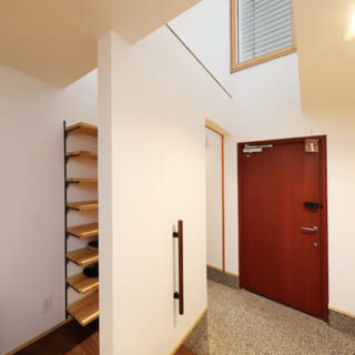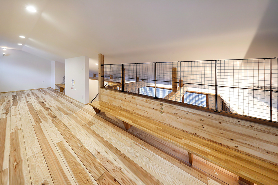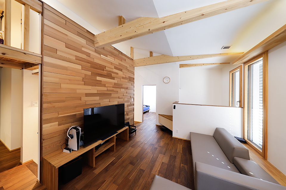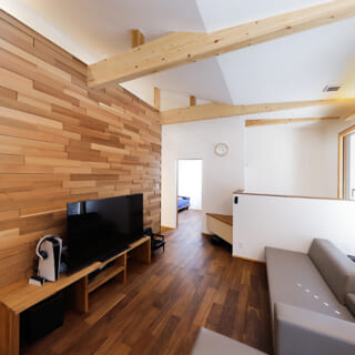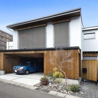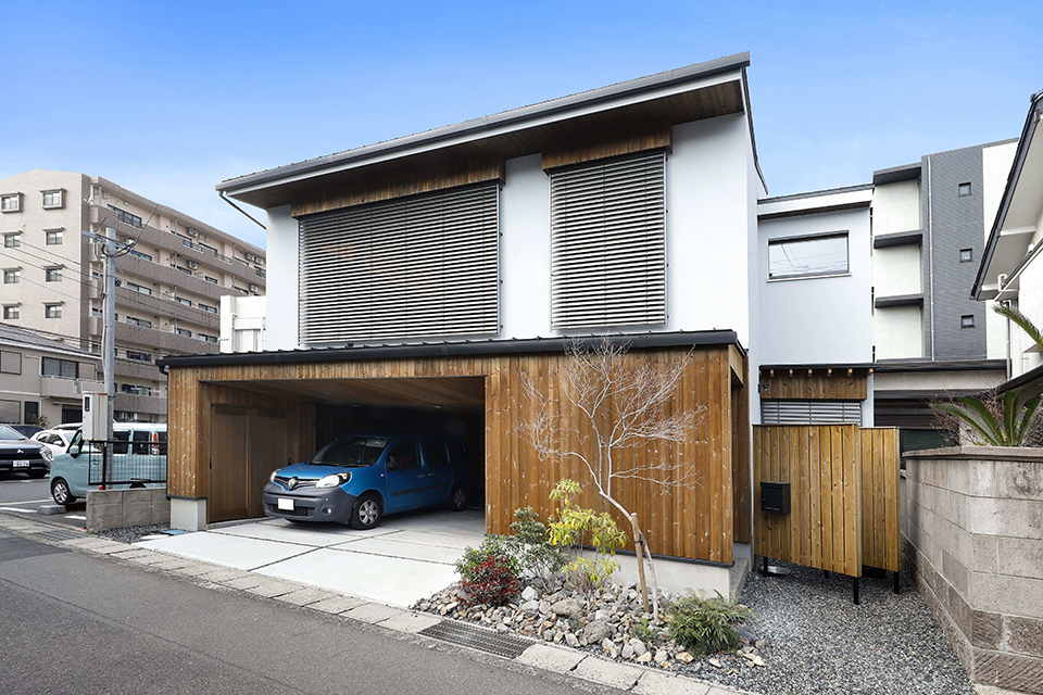 住宅街の中でも自然と触れ合えるよう、全て自然素材の材料で造りました。 2階リビングを採用し、1階は居住空間ではないものを配置することで、天井高を抑え、日々の昇降に苦にならないよう配慮しました。 インナーガレージには杉材を使用し、玄関前にも植栽を植えることで、住宅地の中でも自然を感じられるよう意識しました。 雨が降ると杉の香りを街中で感じられます。